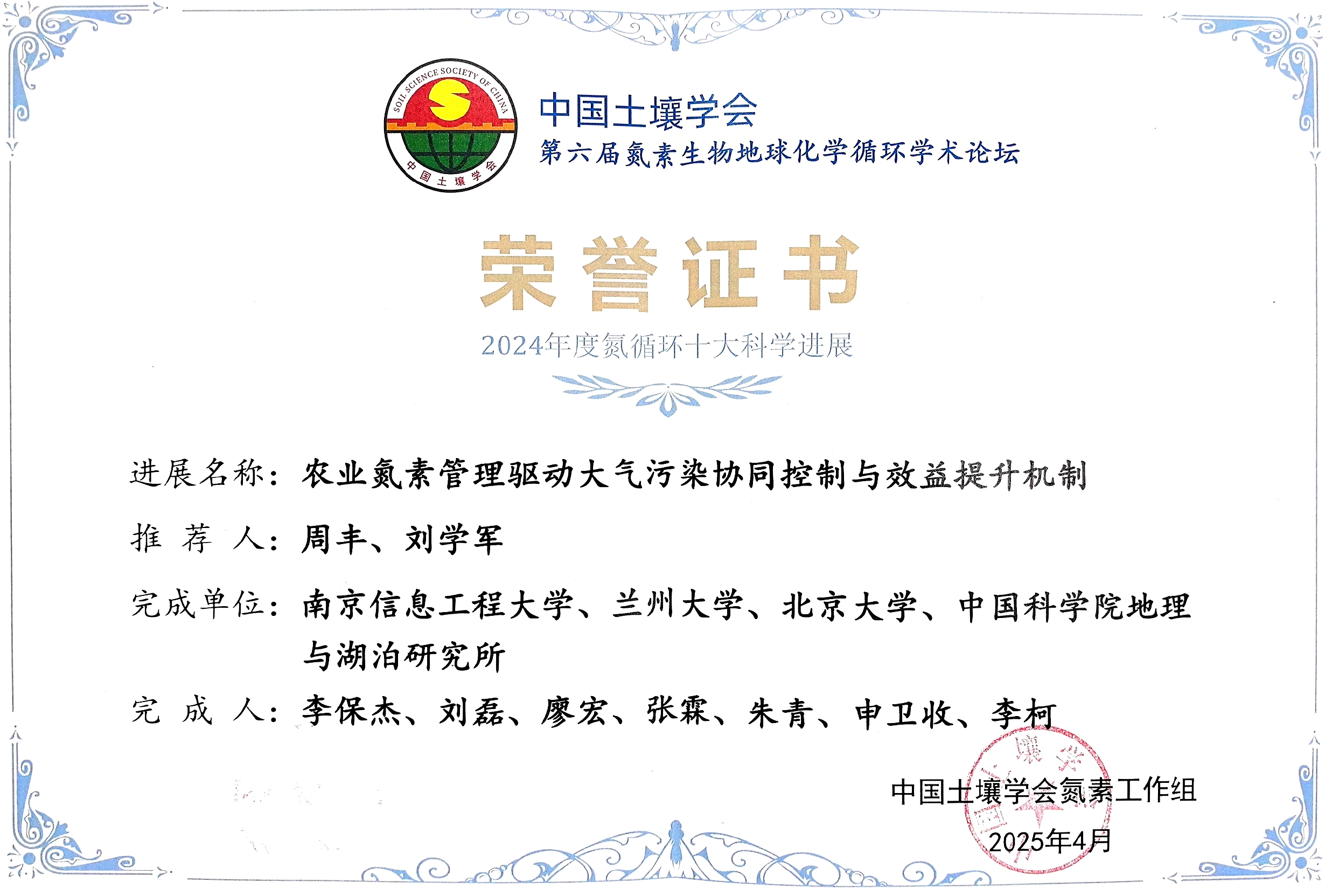 近日,第六届氮素生物地球化学循环学术论坛在南京市成功召开,beat365平台官方网站廖宏教授团队联合中科院南京地理与湖泊研究所、北京大学相关团队的研究成果“农业氮素管理驱动大气污染协同控制与效益提升机制”入选2024年度“氮循环十大科学进展”。成果的主要完成人为李保杰教授、刘磊研究员、廖宏教授、张霖研究员、朱青研究员、申卫收教授、李柯教授。