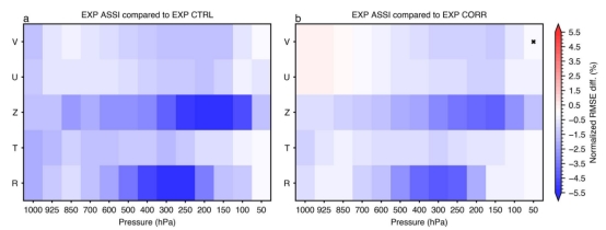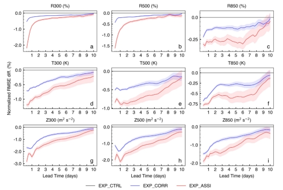 研究设计了同化试验(EXP_ASSI)、修正试验(EXP_CORR)和对照试验(EXP_CTRL)三种配置来评估FuXi-DA的性能。结果显示,其分析误差大幅下降,R300、R500、Z300和Z500的RMSE分别降低约4.47%、2.77%、3.01%和2.02%;预报精度显著提升,7天以内全球Z500 RMSE显著降低,第1天减少0.67%,第7天减少0.34%,且联合优化提升了长期预报表现。同时,该框架具有可解释性,单观测测试的分析增量与通道探测性质一致,能自动区分晴空和有云观测,且计算高效,0.1秒内可完成一次同化模型推理。