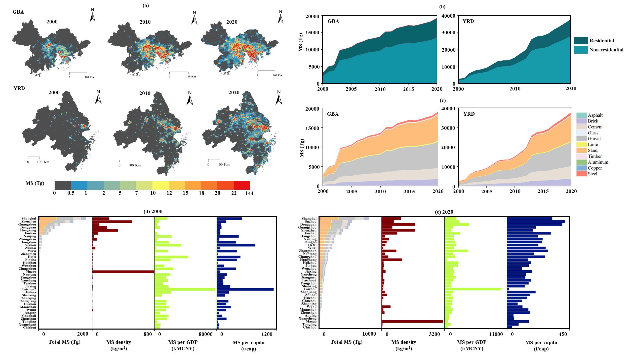 该研究聚焦于中国经济核心区中的——长江三角洲城市群(YRD)和粤港澳大湾区(GBA)。城市群因其高度密集的建筑体量,不仅是物质存量的主要聚集地,也是碳排放的重要来源。因此,精确评估建筑全生命周期,尤其是从原材料开采到产品出厂的“从摇篮到大门”阶段的隐含碳排放(ECE),对于制定有效的减排策略至关重要。研究团队创新性地整合了夜间灯光(NTL)遥感数据、城市建筑轮廓数据及开放街道地图(OSM)数据,运用分水岭分析等技术,在500米网格尺度上构建了建筑容积估算模型。结合各类建筑材料的物质强度(MI)系数和碳排放因子(EF),团队核算了这两个区域内38个城市,共11种主要建筑材料(包括钢材、水泥、砖、砂石等)在2000年至2020年间的物质存量(MS)和“从摇篮到大门”阶段的隐含碳排放(ECE)。