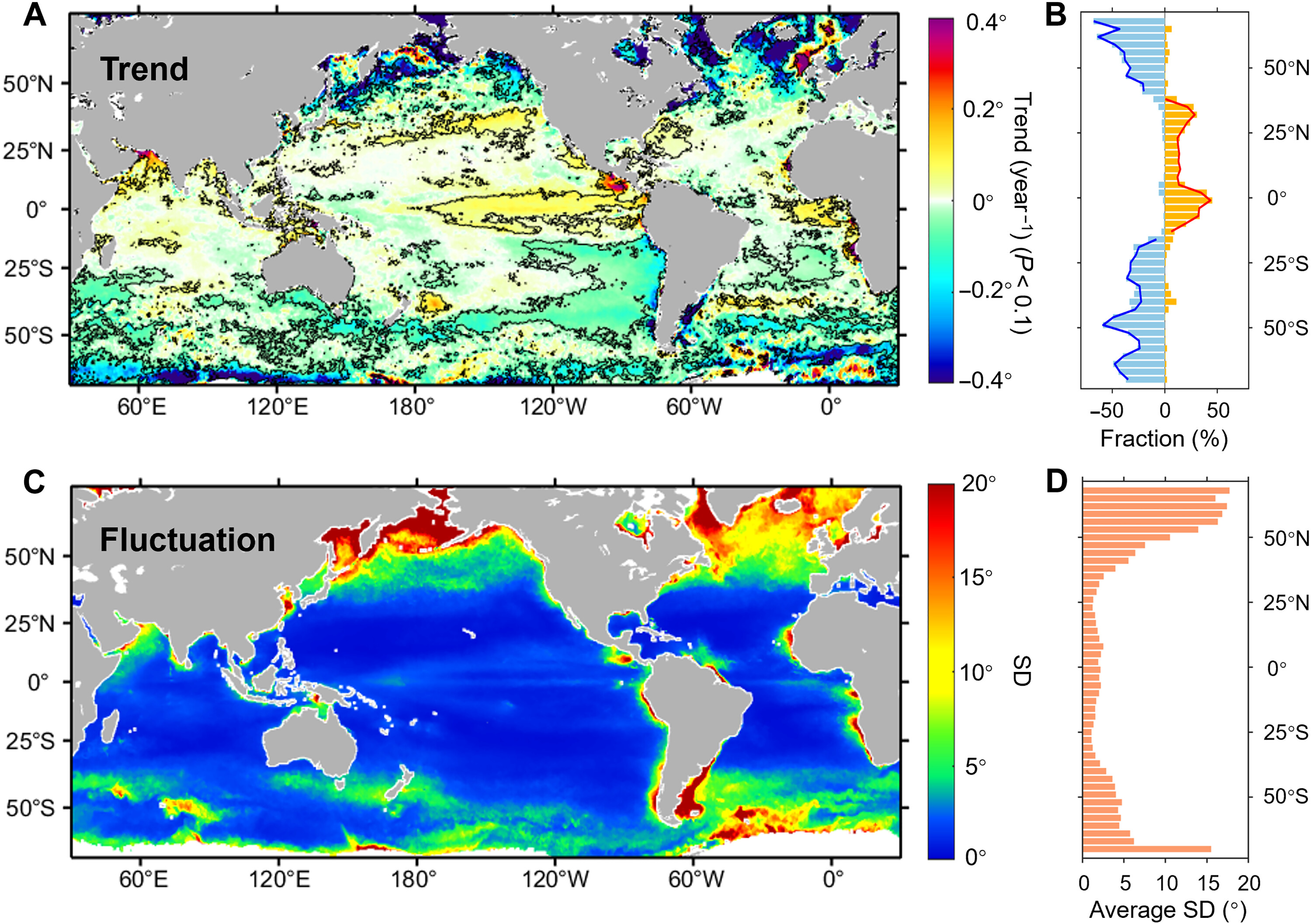 图1过去25年全球海洋水体颜色的时间序列变化特征。(a)基于全球长时序数据,采用Theil-Sen中值法和Mann-Kendall检验计算的色度角(α*)总体趋势空间分布(黑色等值线包围的区域,p< 0.1)。(b)每3°纬度带内,α*呈上升/下降趋势的像元比例随纬度的变化。(c)全球海洋水体颜色异常波动特征(通过标准差[SD]来量化波动幅度)。(d)α*波动的平均纬度分布特征。