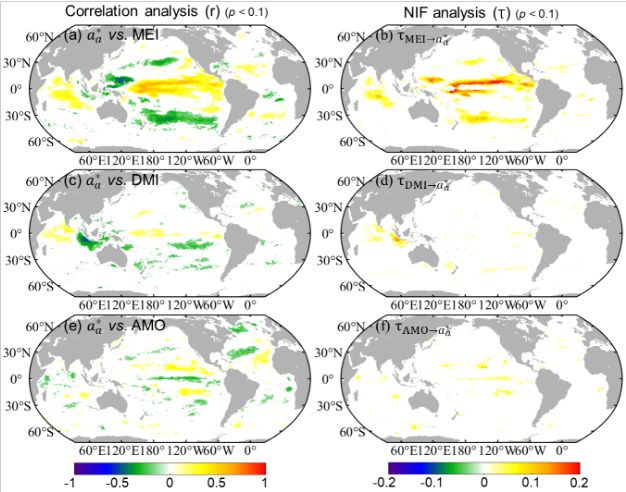 图2全球海洋水色异常与气候强迫的关联特征。基于1998年至2022年全球色度角时间序列异常分量与三个典型气候指数(MEI、DMI、AMO)计算得到的相关系数(r)及归一化信息流(τ)空间分布。图中颜色区域表示通过显著性水平检验(p< 0.1)的像元空间分布。