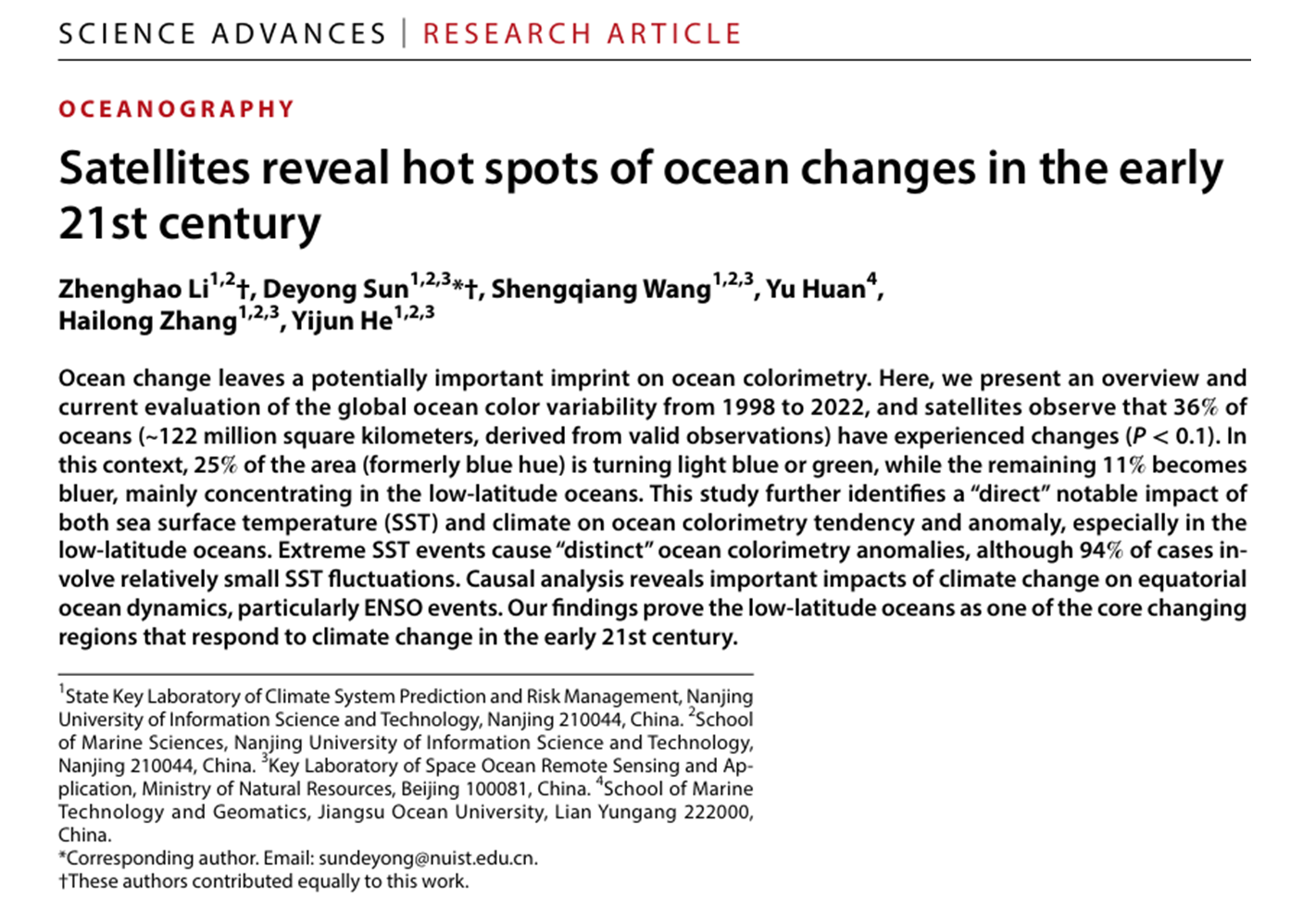 Li, Z.,Sun, D.,Wang, S., Huan, Y., Zhang, H., & He, Y. (2025). Satellites reveal hotspots of ocean changes in the early 21st century. Science Advances, 11, eads0307.https://doi.org/10.1126/sciadv.ads0307