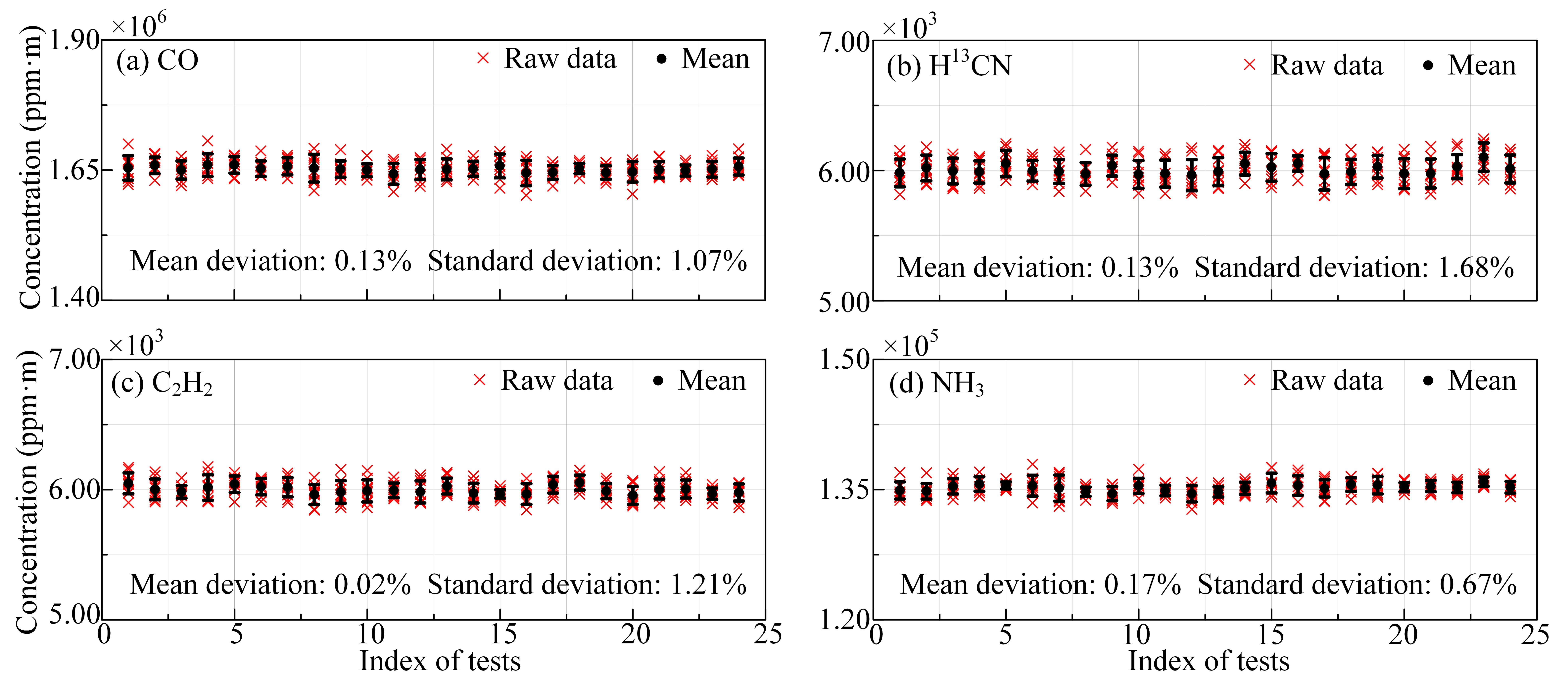 实际测试数据进一步验证了该系统的“精准度”。测试中,采用 1.9 毫瓦激光功率、1 秒探测时间,对 CO、H¹³CN、C₂H₂和 NH₃四种气体的路径积分浓度进行了长时间监测。图 3展示了四种气体实验与拟合结果具有高度一致性,图4 则显示四种气体的测量准度均优于 0.2%,精度优于 2%,充分证明了该系统在实际应用中的可靠性与精准性。